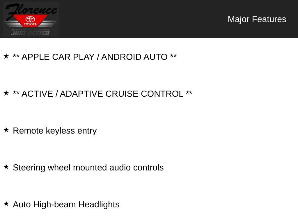 At Florence Toyota come see how our USED CARS are JUST BETTER. We offer the following benefits: Lifetime Power Train (Some exclusions apply), 1st Year Maintenance, $500 Additional Trade In Appraisal, 72 Hour Vehicle Exchange Program, Yearly Vehicle Appraisal & Safety Inspection, VIP Loyalty Program, Routine Express Service, Courtesy Service Shuttle, Express Buying Service. Also, as an added benefit we will buy your vehicle even if you don't buy ours!! Call today (866)830-0793 or visit us at www.florencetoyota.com *Customer must trade-in a vehicle to receive $1,000 Trade Assist credit that is included in the online price. **Financing must be provided by a third-party lender using this dealership's assistance for Customer to receive $1,000 Financing Assist credit that is included in the online price. See dealer for complete details.