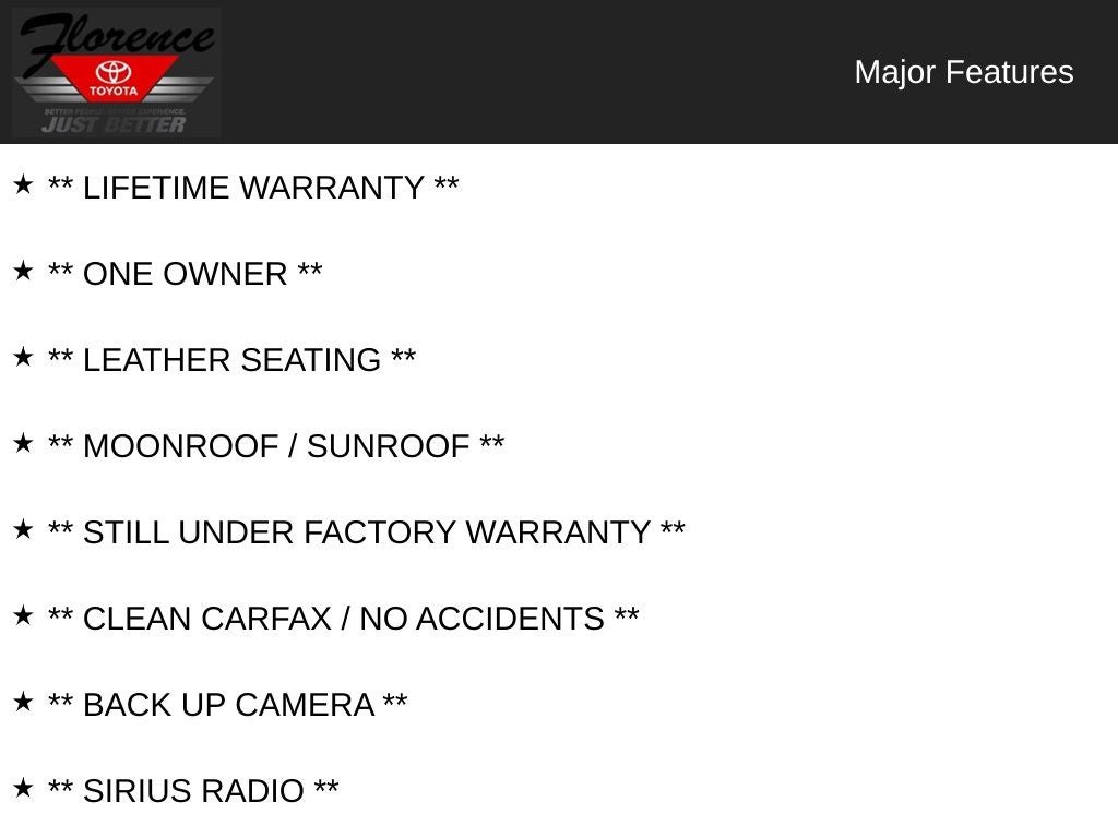 At Florence Toyota come see how our USED CARS are JUST BETTER. We offer the following benefits: Lifetime Power Train (Some exclusions apply), 1st Year Maintenance, $500 Additional Trade In Appraisal, 72 Hour Vehicle Exchange Program, Yearly Vehicle Appraisal & Safety Inspection, VIP Loyalty Program, Routine Express Service, Courtesy Service Shuttle, Express Buying Service. Also, as an added benefit we will buy your vehicle even if you don't buy ours!! Call today (866)830-0793 or visit us at www.florencetoyota.com *Customer must trade-in a vehicle to receive $1,000 Trade Assist credit that is included in the online price. **Financing must be provided by a third-party lender using this dealership's assistance for Customer to receive $1,000 Financing Assist credit that is included in the online price. See dealer for complete details.