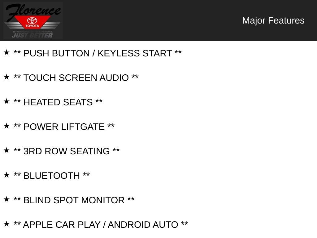 At Florence Toyota, come see how our USED CARS are JUST BETTER. We offer the following benefits: Lifetime Power Train (Some exclusions apply), 1st Year Maintenance, $500 Additional Trade In Appraisal, 72 Hour Vehicle Exchange Program, Yearly Vehicle Appraisal & Safety Inspection, VIP Loyalty Program, Routine Express Service, Courtesy Service Shuttle, Express Buying Service. Also, as an added benefit we will buy your vehicle even if you don't buy ours!! Call today (866)830-0793 or visit us at www.florencetoyota.com *Customer must trade-in a vehicle to receive $1,000 Trade Assist credit that is included in the online price. **Financing must be provided by a third-party lender using this dealership's assistance for Customer to receive $1,000 Financing Assist credit that is included in the online price. See dealer for complete details.