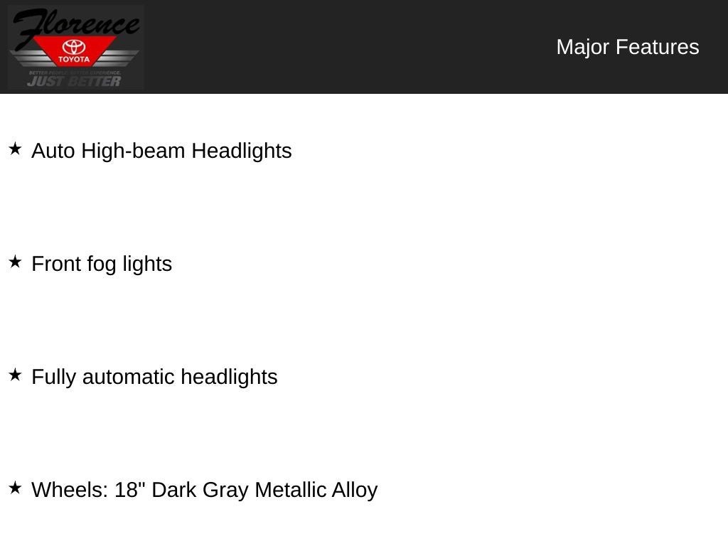 At Florence Toyota, come see how our USED CARS are JUST BETTER. We offer the following benefits: Lifetime Power Train (Some exclusions apply), 1st Year Maintenance, $500 Additional Trade In Appraisal, 72 Hour Vehicle Exchange Program, Yearly Vehicle Appraisal & Safety Inspection, VIP Loyalty Program, Routine Express Service, Courtesy Service Shuttle, Express Buying Service. Also, as an added benefit we will buy your vehicle even if you don't buy ours!! Call today (866)830-0793 or visit us at www.florencetoyota.com *Customer must trade-in a vehicle to receive $1,000 Trade Assist credit that is included in the online price. **Financing must be provided by a third-party lender using this dealership's assistance for Customer to receive $1,000 Financing Assist credit that is included in the online price. See dealer for complete details.